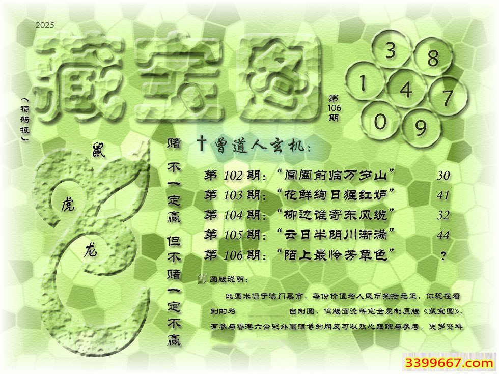 106期藏寶圖 新:陌上最怜芳草色 老:为问只今江海上 禁:狗 禁:2尾