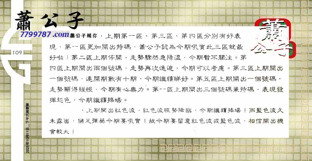 | 主题 :109期:六合皇金句/老总论码/萧公子/林大师/五行夺码/老总信箱截 |