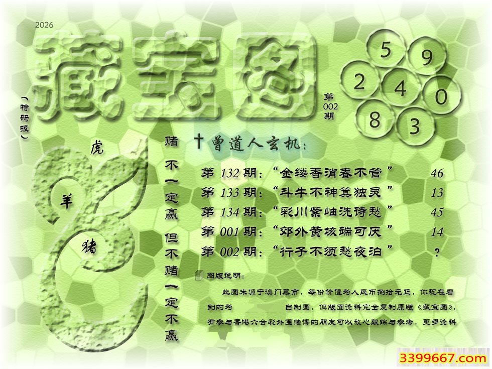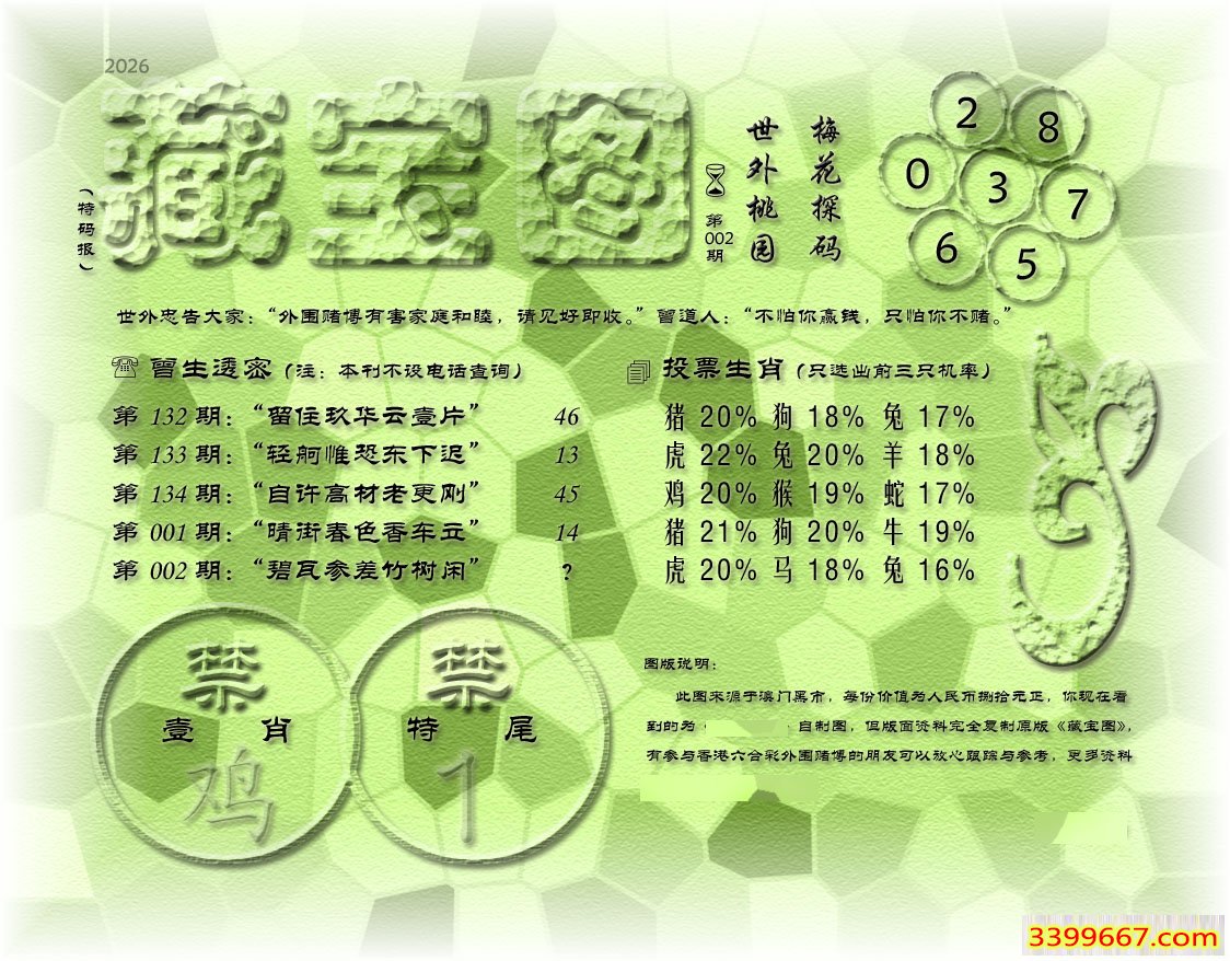 主题 :002期藏寶圖 新:行子不须愁夜泊 老:碧瓦参差竹树闲 禁:鸡 禁:1尾